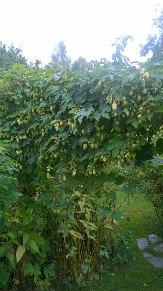 Har ingen bild på egenodlade humle men har hittat två plantor i det vilda. En vid ett ett gammalt brygghus och en i en stenmur. Gjort te på båda och de är snarlika. Smaken? Stor beska.