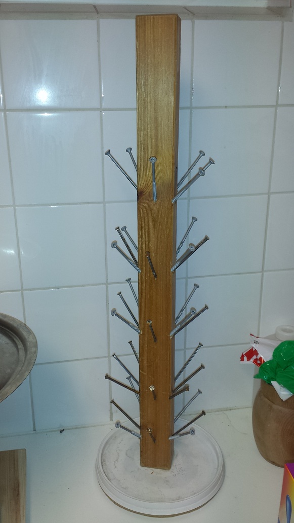 Ett bordsben, ett lock till en gammal målarburk, ett gäng 4" spik och skruv så är det klart